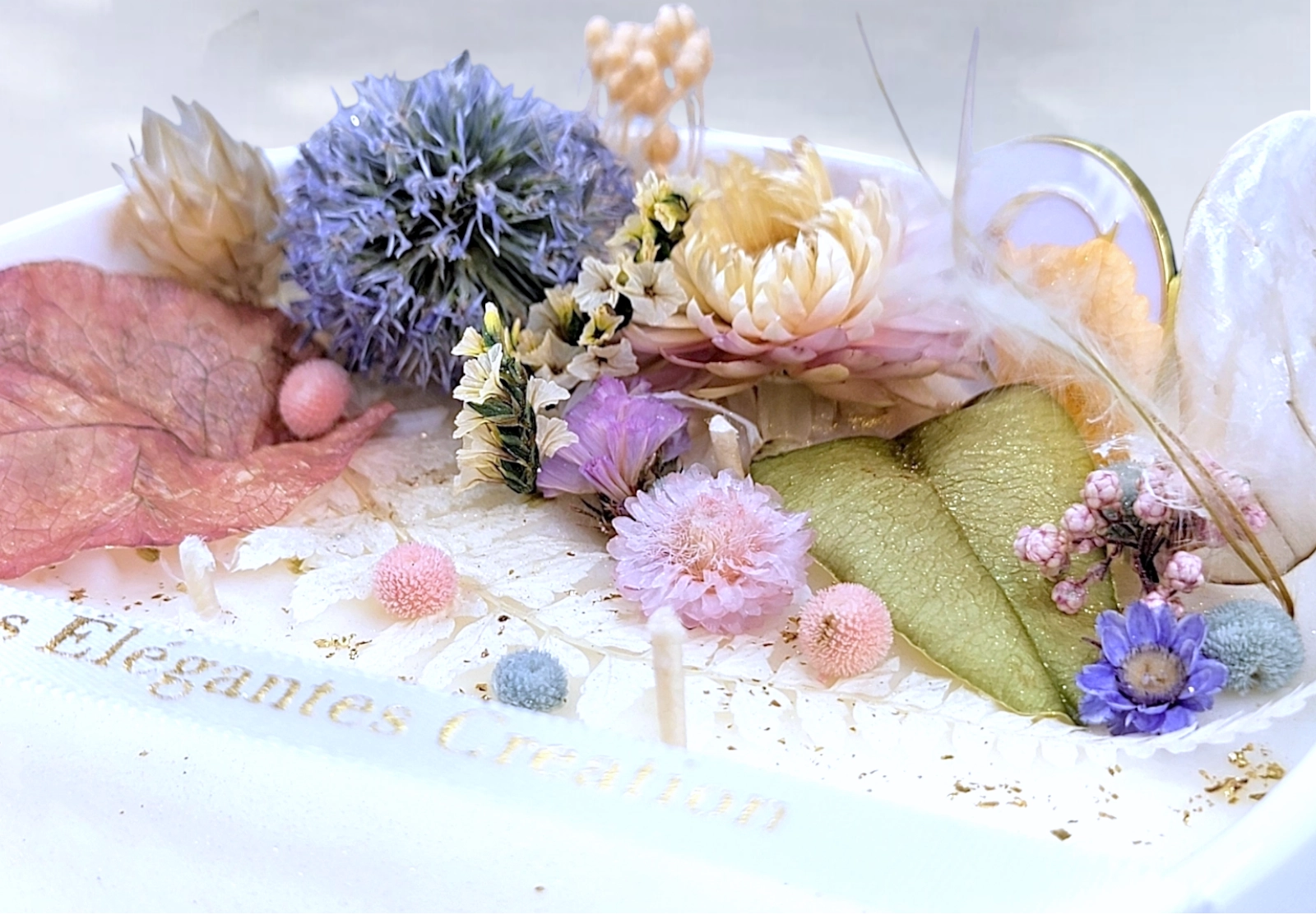 Découvrez la Bougie fleurs séchées Fleur de Coton , une œuvre d'art aux nuances véritables pastels sublimées par de l'or 24 Carats.